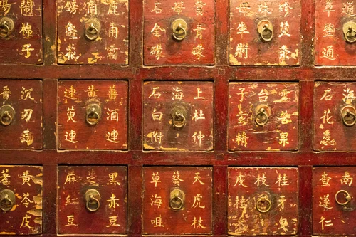 Chinese herbs are traditionally kept in cabinets of many drawers extending high up, sometimes covering an entire wall or more in a pharmaceutical workplace. The drawers are labeled and skilled practitioners, after working hundreds of times through the same formulas, will memorize patterns of the drawers, much like the ingredients of the formulas. We have a big cabinet in our herbal pharmacy.